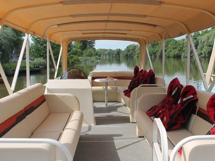The pontoon boat “Teris” (trimaran) refers to the water transport of increasing comfort. This vessel has excellent operational characteristics – safety, stability, unsinkability, strength and lightness. Its spacious deck can accommodate up to 10 people, there is a place to store bags and a table for drinks.